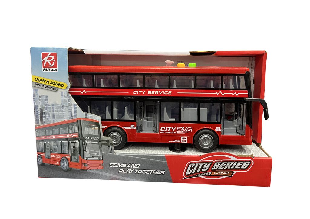 AUTOBUS DE DOS PISOS A FRICCION CITY SERIES. CUENTA CON EFECTOS DE SONIDO Y LUCES ADEMAS LAS PUERTA SE PUEDEN ABRIR Y CERRAR. DIMENSIONES DEL PACKAGING: 32 CM X 10 CM X 18 CM. FUNCIONA CON 3 PILAS AG13. (INCLUYA PILAS DE PRUEBA) EL MODELO VIENE EN 3 COLORES SURTIDOS: VERDE AZUL ROJO.