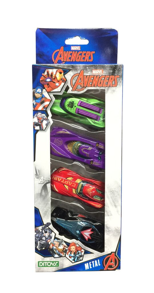 AUTITOS AVENGERS DE METAL SET X4 DITOYS 2644 DIVERTIDO CONJUNTO DE AUTITOS DE LOS VENGADORES PARA CORRER Y COMPETIR DECORACIONES LLAMATIVAS HACEN QUE ELLOS SEAN UNICOS Y COLECCIONABLES. HAY 10 MODELOS DISTINTOS PODES ELEGIR SUS VARIANTES EN LA PUBLICACION LOS AUTITOS SON DE MATERIAL DE METAL ESCALA 1:64 MIDEN APROX. 8 CM DE LARGO X 3 CM DE ANCHO X 3 CM DE ALTO DEPENDIENDO DEL MODELO