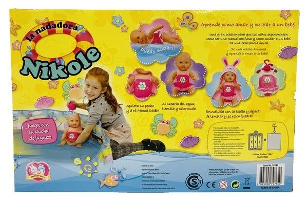 MUNECA NIKOLE LA NADADORA ORIGINAL LALELU CAJA CONTENIENDO MUNECA Y ACCESORIOS REALIZA VARIAS ACCIONES NADA DICE MAMÂ TIEMBLA Y ESTORNUDA DEJA DE TEMBLAR AL COLOCARLE LA TOALLA ACCESORIOS LA MULENETA TRAE PUESTA MALLA ENTERIZA REAL DUCHA DE MANO PERCHA TOALLA CON CAPUCHA OREJAS DE CONEJO FUNCIONA CON 3 PILAS AA (INCLUIDAS)