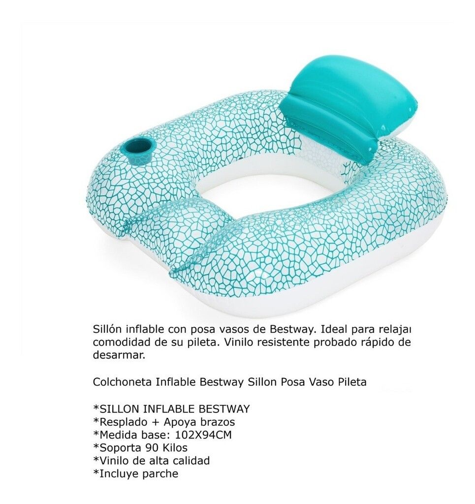 – IMPORTANTE- LOS INFLABLES NO CUENTAN CON GARANTIA- UNICAMENTE PERIODO DE PRUEBA DE 24 HS DE RECIBIDA LA MERCADERIA CON CAMBIO UNICAMENTE EN EL LOCAL- LUEGO DE ESE PLAZO CUENTA CON LOS PARCHES PARA SU REPARACION. SUPER COMODO. MEDIDAS- 1-02 X 0-94 MTS. VINILO RESISTENTE PROBADO. VALVULAS DE SEGURIDAD. SE INFLA FACILMENTE. MUY RAPIDO DE ARMAR Y DESARMAR. DESINFLADO OCUPA MUY POCO LUGAR POR ELLO ES IDEAL PARA TRASLADARLO A DONDE VAYAS. PESO MAXIMO 90 KILOS.