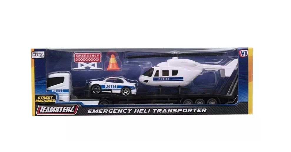 EQUIPO DE RESCATE CON TODO LO NECESARIO PARA UNA EPICA AVENTURA: UN PODEROSO CAMION CON TRAILER DE 25CM DE LARGO + HELICOPTERO DE EVACUACION + AUTO + CONO/CARTEL !VIVI UN RESCATE DE PELICULA CON TEAMSTERZ!