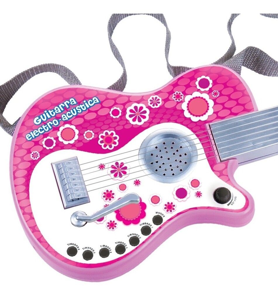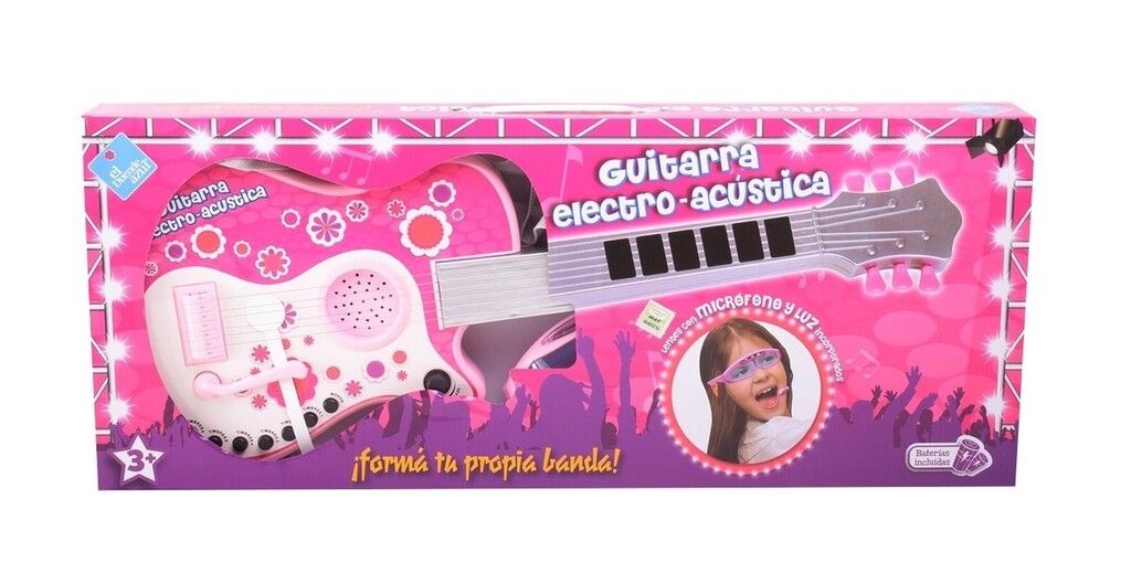 LA GUITARRA ELECTRO ACUSTICA ES GENIAL PARA EMPEZAR A FORMAR TU BANDA. CONTIENE LENTES CON MICROFONO Y LUZ INCORPORADOS ADEMAS DE: -MODO ACUSTICO. -6 TIMBRES MELODICOS. -PALANCA CON 2 MELODIAS. -4 SONIDOS DE BASE. -4 CANCIONES. -PALANCA DE VOLUMEN. -3 MODALIDADES DE MUSICA. REQUIERE 3 PILAS AA (INCLUIDAS).