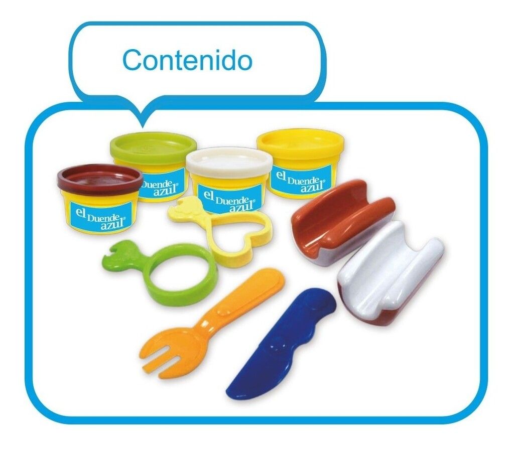 PREPARA LOS MEJORES MENUS CON LA MASA DEL DUENDE AZUL! ESTA VEZ- PUEDES HACER RICOS HOT DOGS. -INCLUYE – 4 POTES DE 28 GRAMOS DE MASA- 2 MOLDES- 2 CUBIERTOS Y 2 BASES PARA COLOCAR LAS MASAS EN FORMA DE PAN.