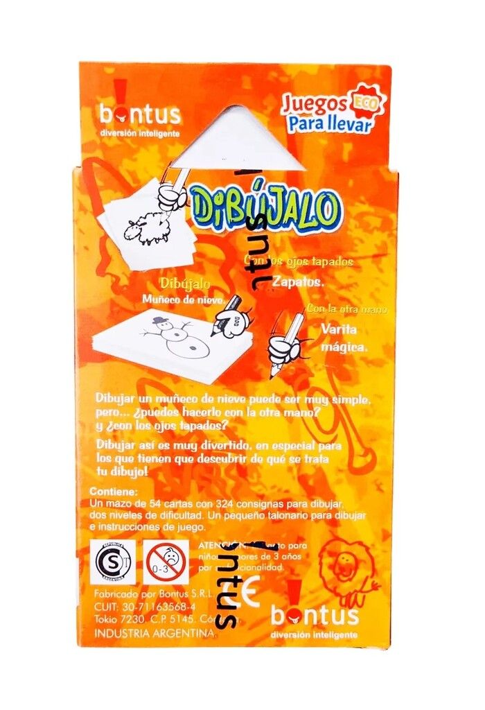 DIBUJALO – JUEGOS ECO PARA LLEVAR – BONTUS CON LA OTRA MANO Y AHORA…CON LOS OJOS CERRADOS! DIBUJAR UN MUNECO DE NIEVE PUEDE SER MUY SIMPLE. PERO…¿PUEDES HACERLO CON LA OTRA MANO? Y ¿CON LOS OJOS TAPADOS? DIBUJAR ASI ES MUY DIVERTIDO EN ESPECIAL PARA LOS QUE TIENEN QUE DESCUBRIR DE QUE SE TRATA TU DIBUJO! CONTIENE: 1 MAZO DE 54 CARTAS CON 324 CONSIGNAS PARA DIBUJAR 2 NIVELES DE DIFICULTAD 1 PEQUENO TALONARIO PARA DIBUJAR INSTRUCCIONES