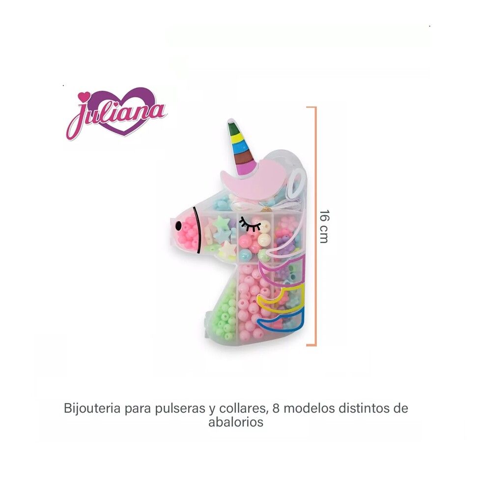 JULIANA I LOVE UNICORN BIJOU + REGALO SORPRESA!! DESCRIPCION DEL PRODUCTO ? BIJOU ? MODELO SURTIDO SEGUN STOCK DISPONIBLE ? CONTIENE 8 MODELOS DISTINTOS DE ABALORIOS ? CON HILO PARA CREAR PULSERAS Y COLLARES! ? EDAD RECOMENDADA: +3 ANOS ? LAS ESPECIFICACIONES COLORES Y CONTENIDO PUEDEN VARIAR CON RESPECTO A LA ILUSTRACION ? EL REGALO SORPRESA PUEDE LLEGAR A SER UNA CORONA O UNA VARITA O UN COLLAR CON UN ANILLO ? CODIGO: SISJUL085