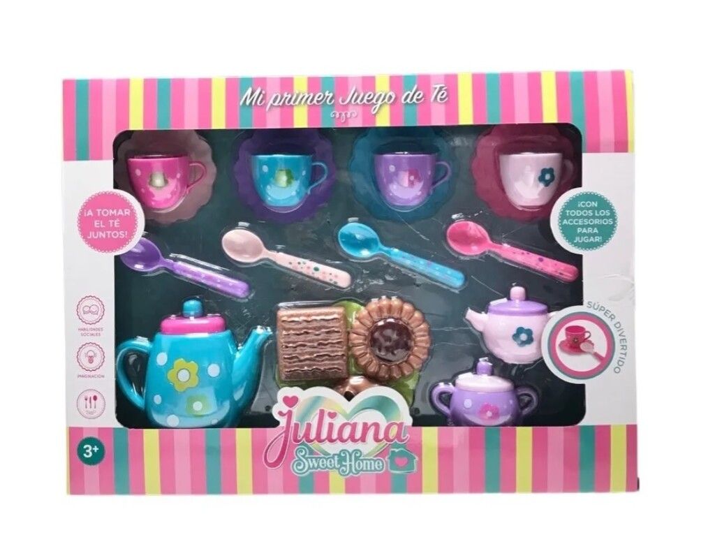 JULIANA SWEET HOME MI PRIMER JUEGO DE TE 19 PIEZAS PLASTICO DESCRIPCION DEL PRODUCTO ? MI PRIMER JUEGO DE TE ? MARCA: JULIANA ? ESTE SET INCLUYE: 4 TAZAS 4 PLATITOS TETERA GRANDE TETERA CHICA AZUCARERA 3 GALLETAS ? LAS IMAGENES Y COLORES SON A MODO ILUSTRATIVO PUEDEN VARIAR. ? EL JUEGO DE TE DE JULIANA ESTIMULA LOS JUEGOS POR IMITACION AYUDANDO A DESARROLLAR LA IMAGINACION Y LA COGNICION DE LAS NINAS Y NINOS! TAMBIEN PROMUEVE LA CURIOSIDAD Y ES SUPER DIVERTIDA! ? EDAD RECOMENDADA: +3 ANOS ? CODIGO: SISJUL059