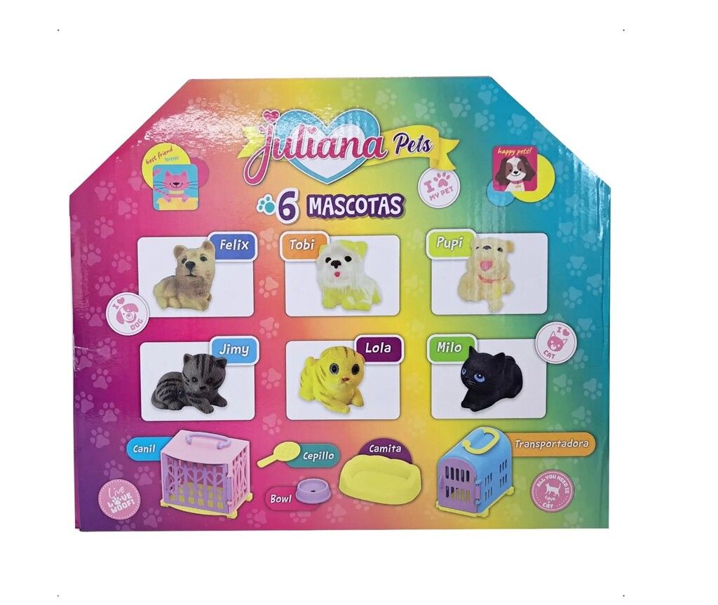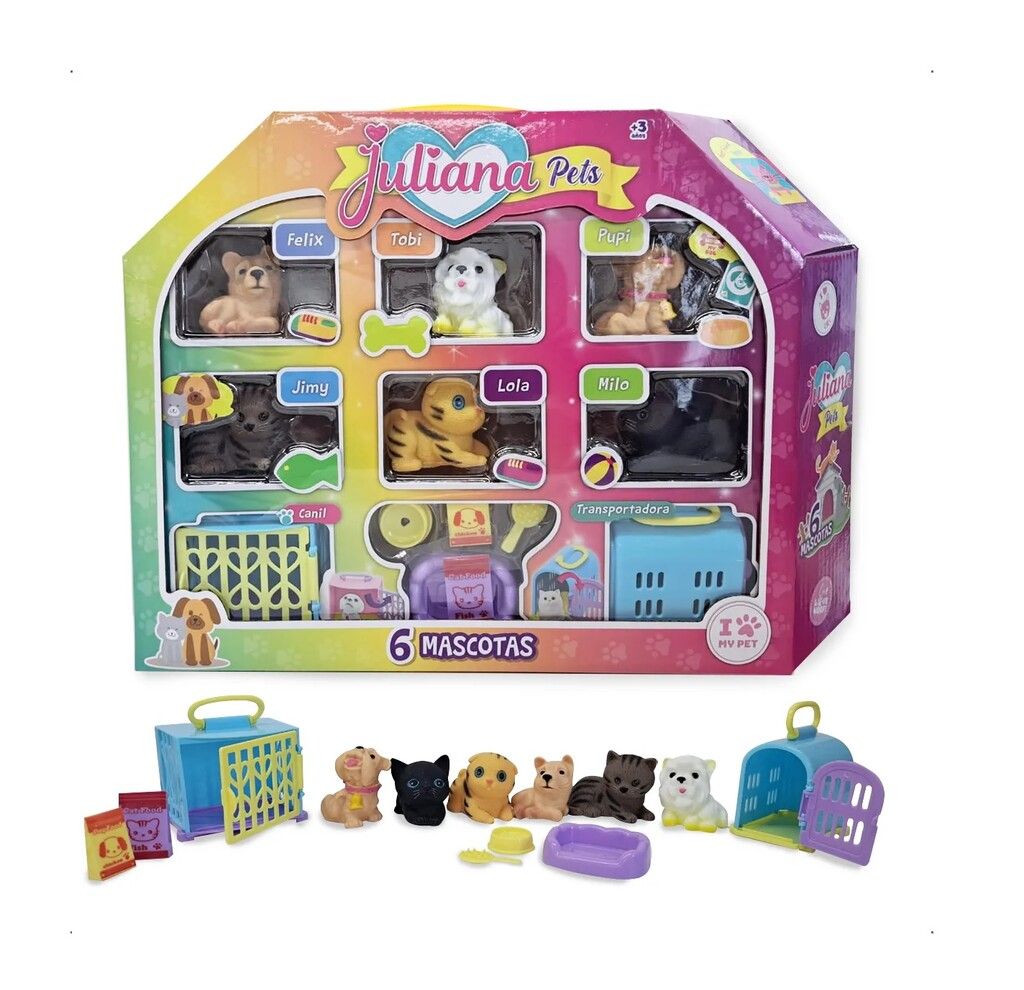 DESCUBRE EL EMOCIONANTE MUNDO DE JULIANA PETS CON EL JUGUETE DE MASCOTAS QUE ENCANTARA A LOS MAS PEQUENOS. ESTE SET INCLUYE 6 ADORABLES MASCOTAS CADA UNA EQUIPADA CON UN CHIRRIADOR QUE EMITE SONIDOS DIVERTIDOS AL APRETARLAS ESTIMULANDO LA IMAGINACION Y EL JUEGO INTERACTIVO.