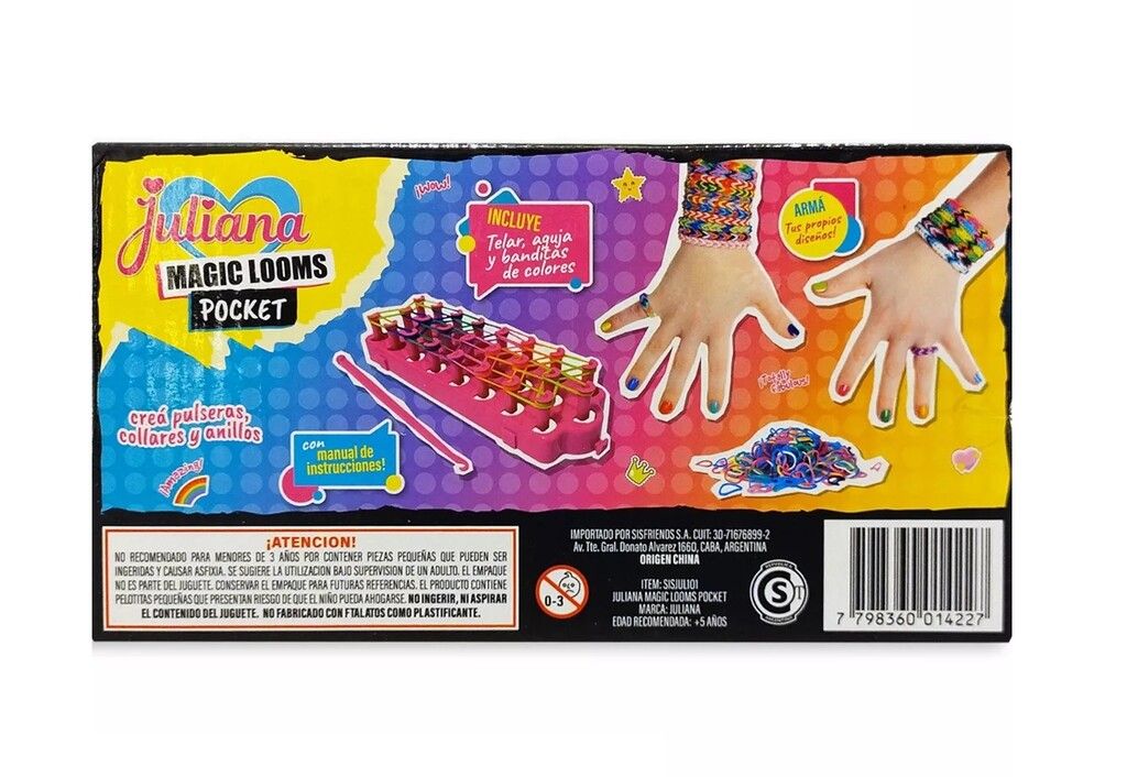 DESCRIPCION DEL PRODUCTO ? JULIANA MAGIC LOOMS POCKET ? INCLUYE TELAR AGUJA BANDITAS DE COLORES Y GANCHITOS! ? CON MANUAL DE INSTRUCCIONES! ? CREA PULSERAS COLLARES Y ANILLOS CON TUS PROPIOS DISENOS! ? MEDIDAS DEL PACKAGING: 21 CM X 11 CM X 35 CM ? MEDIDAS DEL TELAR: 17 CM X 5 CM X 3 CM ? EDAD MINIMA RECOMENDADA: +3 ANOS. ? LAS ESPECIFICACIONES COLORES Y CONTENIDO PUEDEN VARIAR CON RESPECTO A LA ILUSTRACION. ? ORIGEN: CHINA ? CODIGO: SISJUL101