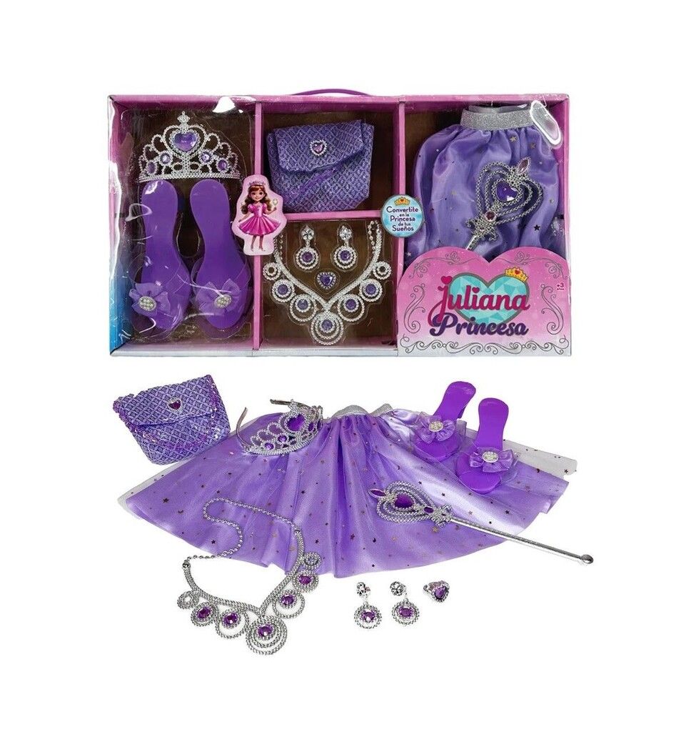 JULIANA PRINCESA SET COMPLETO FANTASIA CON UN LOOK LLENO DE MAGIA Y BRILLO TRANSFORMATE EN UNA VERDADERA PRINCESA. USA LA CORONA LA POLLERA Y LOS ZAPATITOS PARA VIVIR AVENTURAS DE CUENTO MIENTRAS LA VARITA MAGICA LE DA EL TOQUE FINAL A TU ESTILO REAL. PERFECTO PARA IMAGINAR JUGAR Y CREAR HISTORIAS LLENAS DE FANTASIA. CONVERTITE EN LA PROTAGONISTA DE TU PROPIO CUENTO INCLUYE: 1 ZAPATOS 1 POLLERA 1 CARTERA 1 CORONA Y 1 VARITA