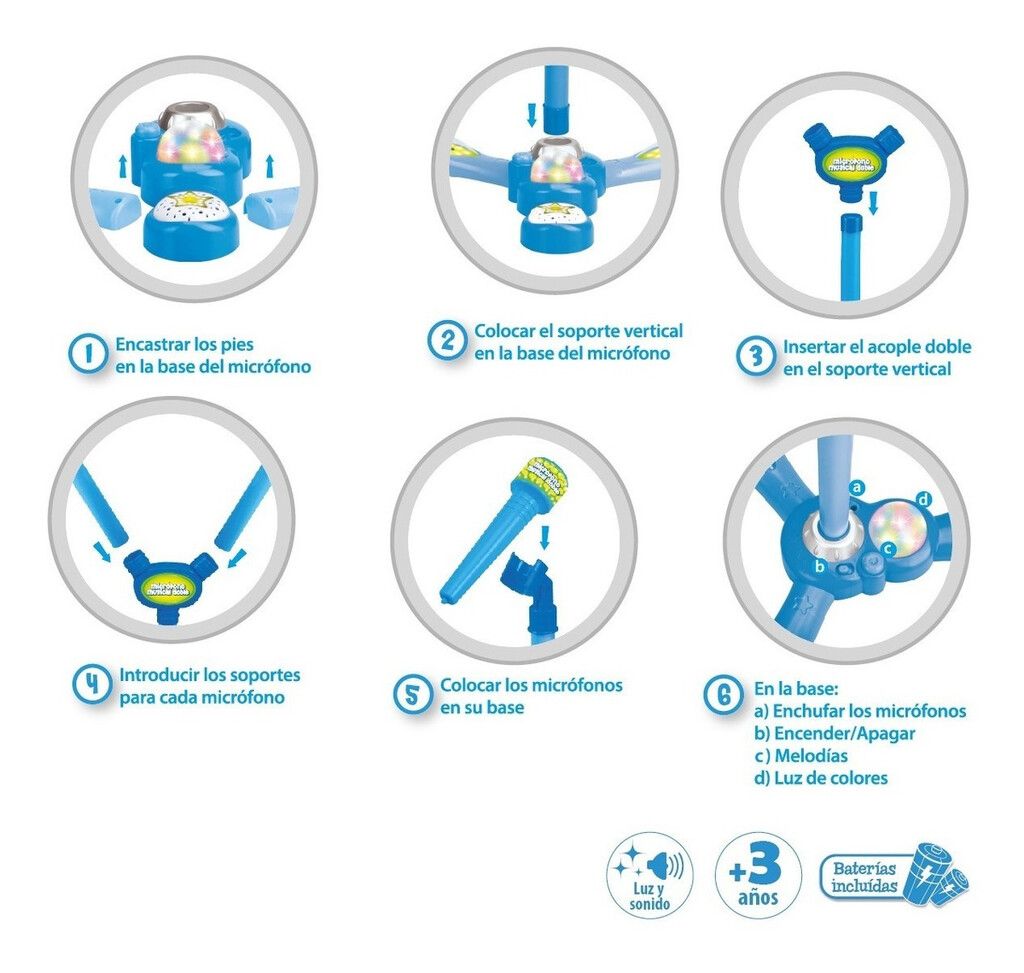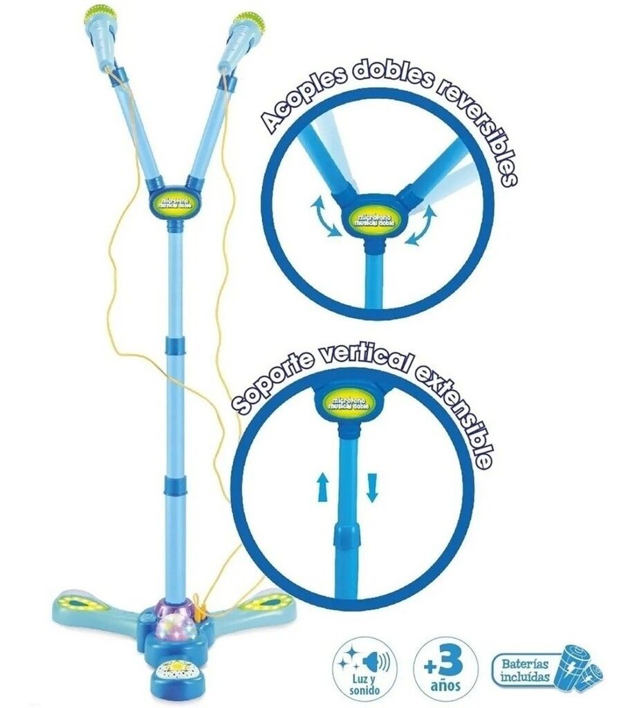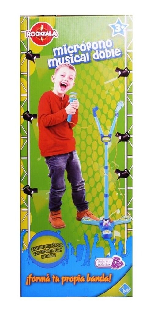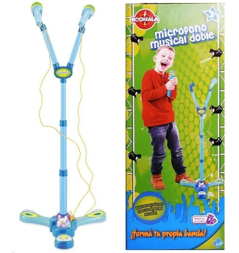 MICROFONO MUSICAL DE PIE DOBLE INFANTIL FORMA TU PROPIA BANDA CON EL MICROFONO MUSICAL DOBLE INFANTIL UNISEX DE EL DUENDE AZUL. CONTIENE BASE DE MICROFONO CON LUZ RITMICA Y MELODIAS- ADEMAS DE INCLUIR- 2 MICROFONOS CON CABLE- PIE CON LUZ EN LA BASE Y SONIDO- 1 SOPORTE VERTICAL EXTENSIBLE- 1 ACOPLE DOBLE Y 2 SOPORTES DE MICROFONO. !ROCKEALA!