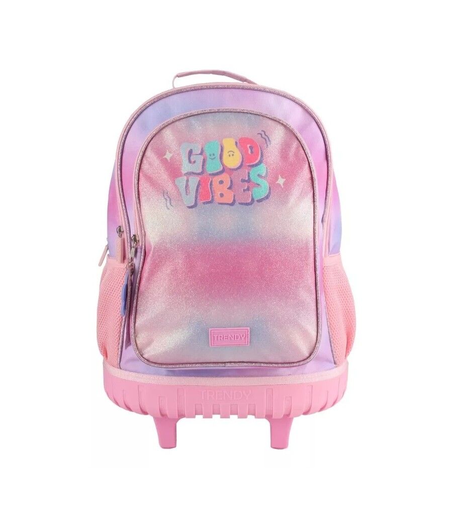 MARCA: TRENDY CARACTERISTICAS: ? IDEAL PARA USAR CON LAS RUEDITAS CUANDO SE LLEVA MUCHO PESO. ? AYUDA A PREVENIR EL MALESTAR EN LA ESPALDA DE LOS NINOS Y SUS POSIBLES LESIONES. ? SU SISTEMA CON RUEDA DE SILICONA PERMITE UNA MEJOR TRACCION Y DURACION. ? MANIJA EXTENDIDA 80 CM ALTO TOTAL ? MEDIDAS MOCHILA: 47 X 35 X 17 – 18 PULGADAS – ? AMPLIO COMPARTIMIENTO CENTRAL ? BOLSILLOS LATERALES DE RED PORTA BOTELLAS ? BOLSILLO FRONTAL CON ADORNO. ? INTERIOR FORRADO ? RUEDAS DE SILICONA ? ASA SUPERIOR REFORZADA ? LOGO DE LA MARCA EN GOMA ? TIRA CIERRE CON DIBUJO PERSONALIZADO.