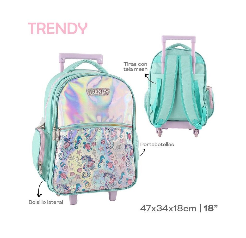 PRODUCTO OFICIAL – ORIGINAL TRENDY PRECIO POR UNIDAD. MOCHILA CON CARRITO TRENDY ORIGINAL DISENO MODERNO ANIMALITOS ACUATICOS. BASE Y RUEDAS REFORZADAS RUEDAS CUBIERTAS EN SILICONA PARA UNA MAYOR PROTECCION MATERIALES REFORZADOS CIERRES DE ALTA CALIDAD CARRO REGULABLE EN ALTURA TIRAS ACOLCHONADAS CON TELA AIR MESH ESPALDA ACOLCHONADA BOLSILLO LATERAL BOLSILLO DE RED PORTABOTELLA AMPLIO COMPARTIMIENTO PRINCIPAL UN 2DO COMPARTIMIENTO AL FRENTE Y BOLSILLO FRONTAL CON CIERRE TIRA CIERRES DE GOMA CON EL LOGO DE TRENDY ESTAMPADO DE UNICORNIOS.