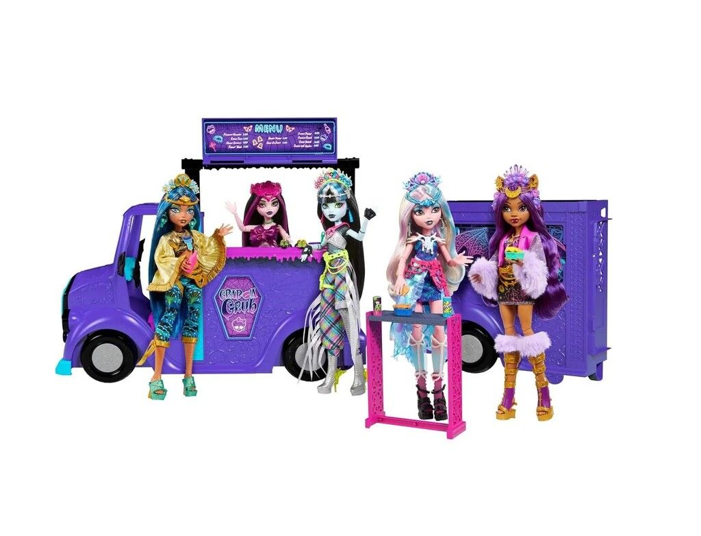 ADENTRATE EN EL EMOCIONANTE MUNDO DE MONSTER HIGH CON EL CAMION ROKIN FOOD DE DRACULAURA. ESTE VIBRANTE CAMION DE COLOR VIOLETA DISENADO PARA BRINDAR HORAS DE DIVERSION CREATIVA ES IDEAL PARA NINOS A PARTIR DE 4 ANOS. SU LLAMATIVA ESTETICA COMBINA A LA PERFECCION LA TEMATICA GOTICA DE MONSTER HIGH CON LA DIVERSION DE UN NEGOCIO DE COMIDA SOBRE RUEDAS.