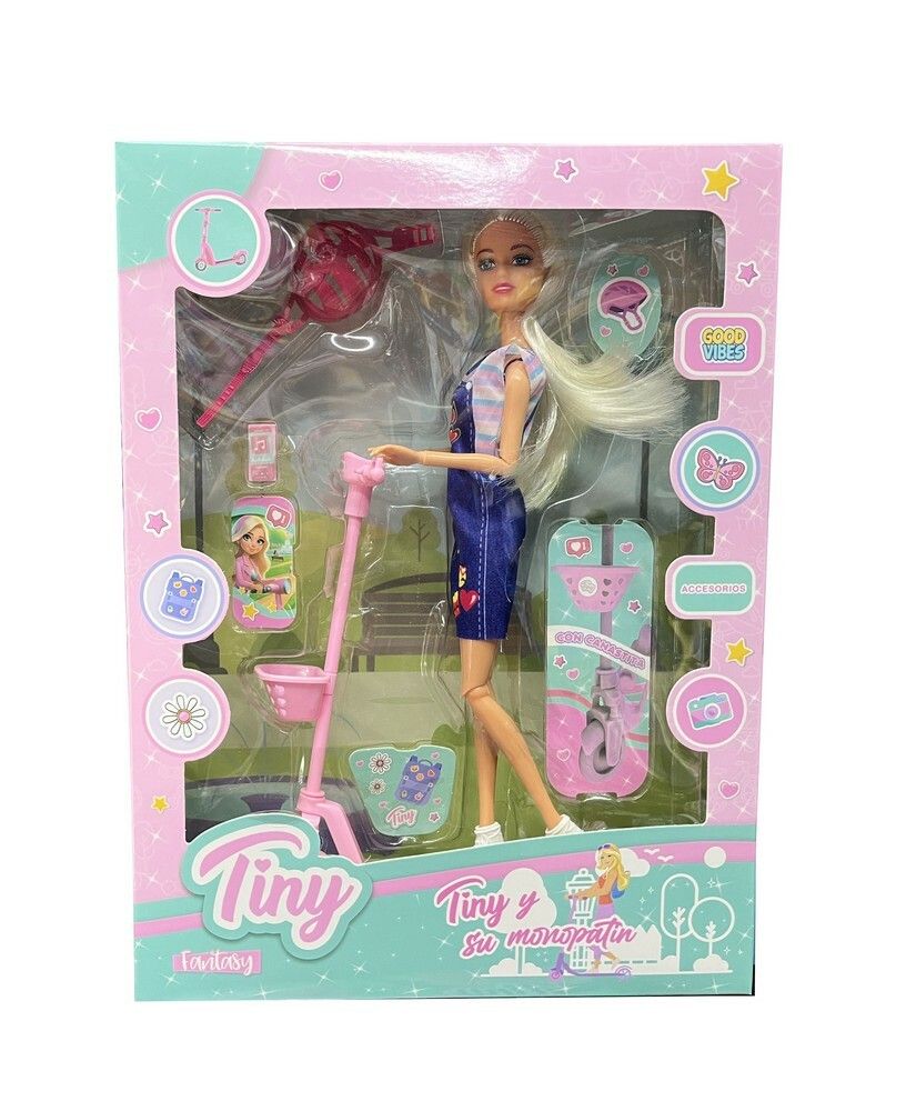 MUNECA Y MONOPATIN MUNECA ARTICULADA: 11 PUNTOS DE ARTICULACION (CABEZA BRAZOS CODOS MANOS PIERNAS Y RODILLAS) INCLUYE: – 1 MUNECA TINY – 1 MONOPATIN – 1 CASCO – STICKERS Y ACCESORIOS