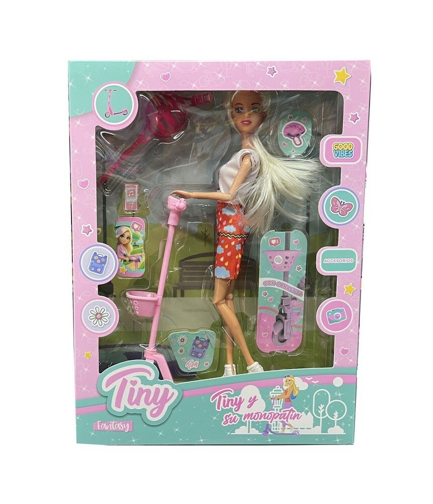 MUNECA Y MONOPATIN MUNECA ARTICULADA: 11 PUNTOS DE ARTICULACION (CABEZA BRAZOS CODOS MANOS PIERNAS Y RODILLAS) INCLUYE: – 1 MUNECA TINY – 1 MONOPATIN – 1 CASCO – STICKERS Y ACCESORIOS