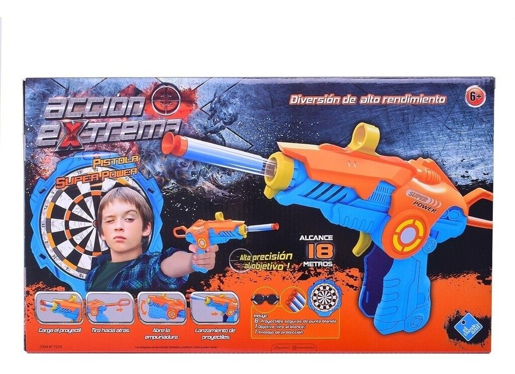 PISTOLA SUPER PAWER- DIVERSION DE ALTO RENDIMIENTO CON UN ALCANCE 18 METROS. INCLUYE- – 6 DARDOS – 1 OBJETIVOS( TIRO AL BLANCO) – ANTEOJO DE PROTECCION.