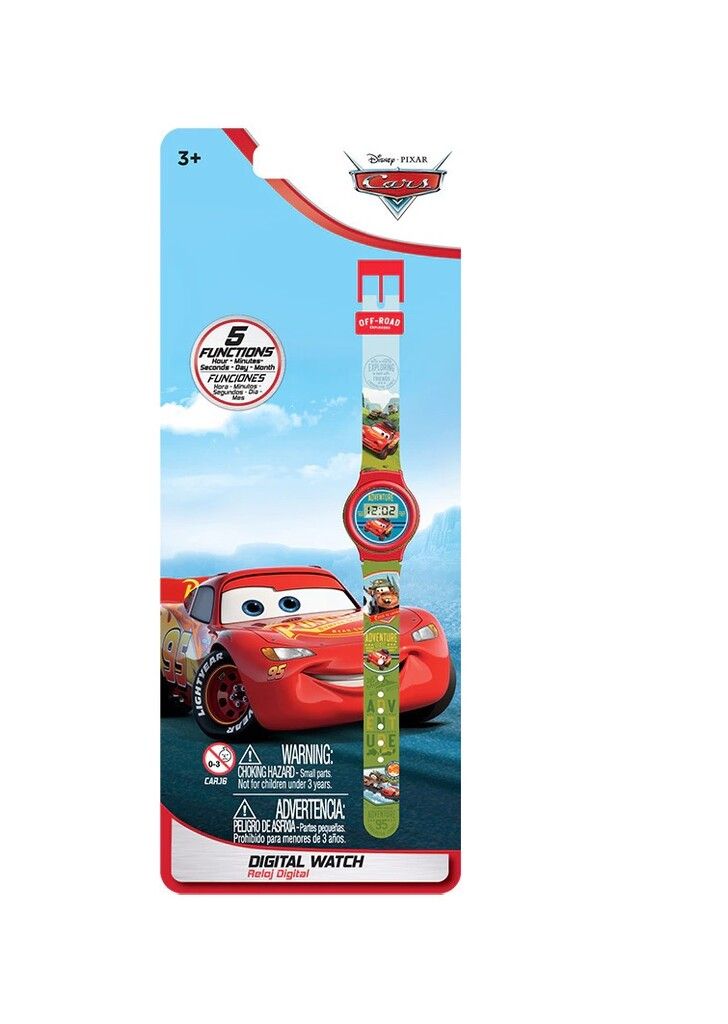 RELOJ PULSERA DIGITAL DE CARS PIXAR CON 5 FUNCIONES: HORA – MINUTOS – SEGUNDOS – DIA – MES. EDAD RECOMENDADA: +3 ANOS. LAS IMAGENES Y COLORES SON A MODO ILUSTRATIVO PUEDEN VARIAR.