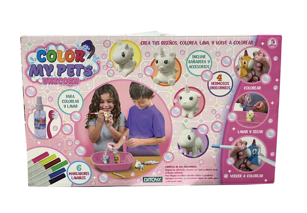 SET PARA COLOREAR MASCOTAS CON 6 MARCADORES LAVABLES COLOR MY PETS ORIGINAL DITOYS ! JUEGO PARA COLOREAR A LAS MASCOTAS- CREA TUS DISENOS- COLOREA- LAVA Y VUELVE A COLOREA LIMPIEZA DE LAS MASCOTAS- DESPUES DE COLOREARLAS- LAVARLAS CON AGUA Y DEJARLAS SECAR EL TIEMPO SUFICIENTE. PARA LIMPIAR NO UTILIZAR UTENSILIOS FILOSOS NI PRODUCTOS QUIMICOS CORROSIVOS. SE RECOMIENDA USAR UN CEPILLO O ESPONJA SUAVE Y DETERGENTE NEUTRO.