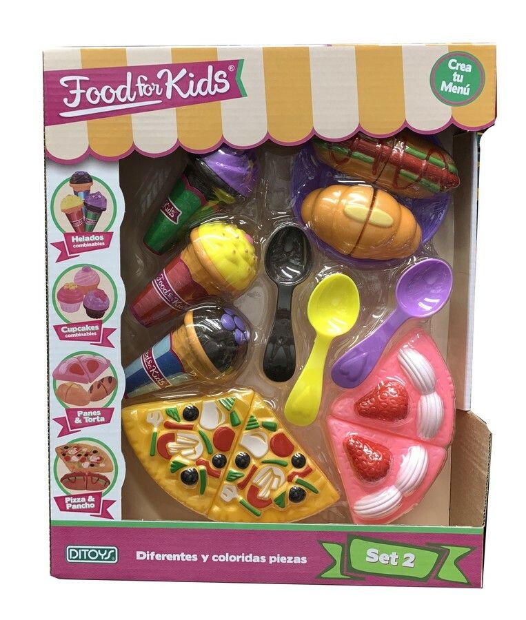 FOOD FOR KIDS- DIFERENTES Y COLORIDAS PIEZAS PARA CREAR TU PROPIO MENU! CONTENIDO DEL SET- 3 HELADOS- 3 CUCHARAS- 2 PORCIONES DE PIZZA- 2 PORCIONES DE TORTA- 1 PAN- 1 PANCHO- 1 PLATO EDAD IDEAL DE USO- +5 ANOS