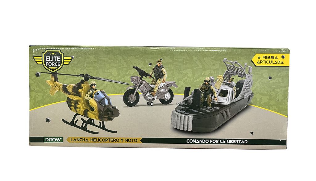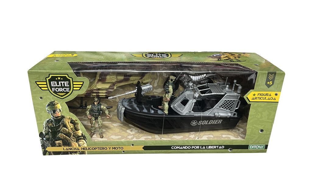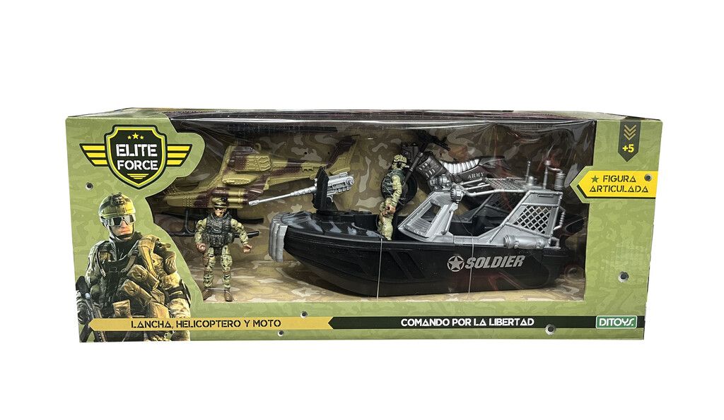 LA LANCHA DE ELITE FORCE ES EL VEHICULO PERFECTO PARA LOS PEQUENOS AVENTUREROS. CON SUS 30 CM DE LARGO ESTE JUGUETE ES IDEAL PARA RECREAR EMOCIONANTES MISIONES Y BATALLAS. INCLUYE: – 1 LANCHA – 2 SOLDADOS ARTICULADOS – 1 HELICOPTERO – 1 MOTO – ACCESORIOS