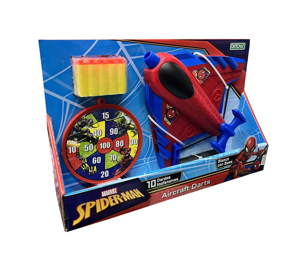 TIRA AL BLANCO CON ESTE DIVERTIDO AVION LANZA DARDOS DE SPIDERMAN!! COLOCAR LA BASE MANIJA EN LA PARTE DE ABAJO DEL AVION COLOCAR LOS DARDOS EN LOS COMPARTIMIENTOS DE LAS ALAS Y EN LA TROMPA LLEVAR HACIA ATRAS LA PALANCA DE ATRAS Y SOLTARLA PARA LANZAR EL DARDO CONTENIDO: -1 AIRCRAFT -1 BASE MANIJA AIRCRAFT -1 BLANCO CON BASE -10 DARDOS DE GOMA MEDIDAS: 20 CM DE LARGO Y 23 CM DE ANCHO