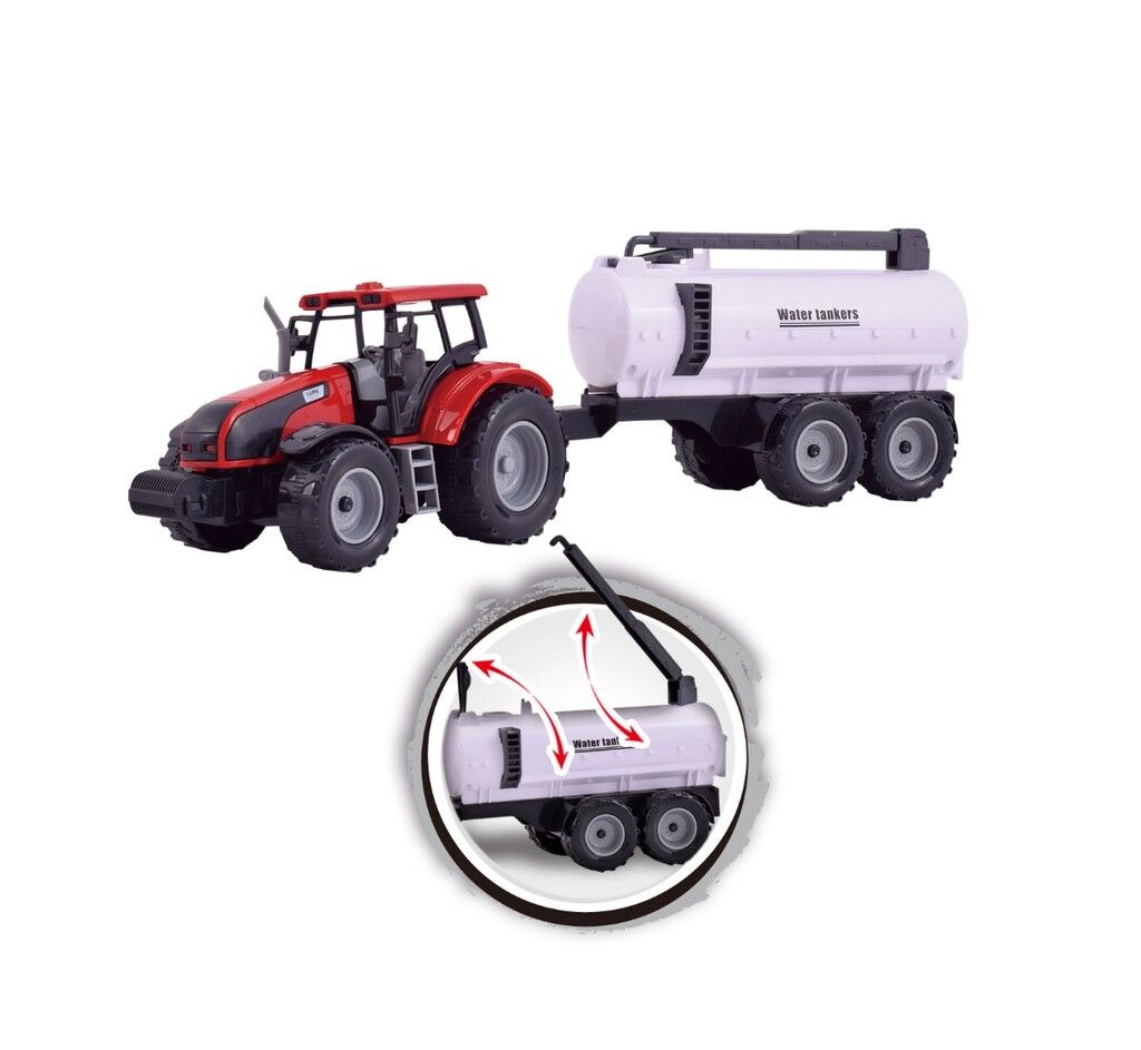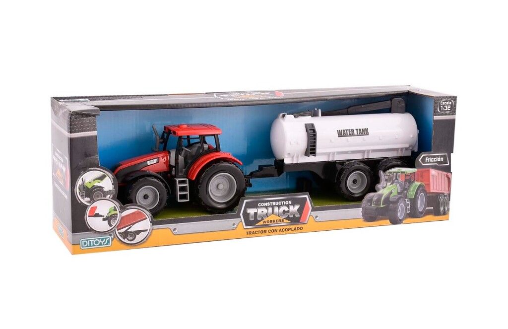 UN TRACTOR CON ACOPLADO CONTENEDORA FRICCION EN ESCALA 1.32. UN JUEGO CON EL QUE PODES CREAR INNUMERABLES HISTORIAS !!! IDEAL PARA EL DESARROLLO DE LA CREATIVIDAD Y HABILIDAD DEL NINO.