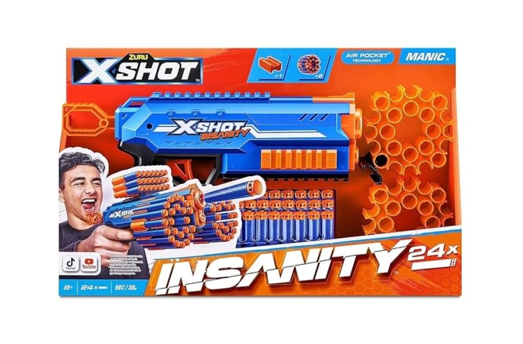 PISTOLA X-SHOT INSANITY. CREA COMBINACIONES INCREIBLES CON EL X-SHOT INSANITY MANIC! EL MANIC ES UN LANZADOR PEQUENO PERO TIENE ESPACIO PARA UN TOTAL DE 46 DARDOS ADICIONALES EN LOS 2 SOPORTES PARA DARDOS INCLUIDOS. EL MANIC ES FACIL DE CARGAR CON EL AGARRE DE CARGA HACIA ATRAS. EL MANIC ES UN LANZADOR DE UN SOLO DISPARO. EL LANZADOR VIENE CON 24 DARDOS CON TECNOLOGIA X-SHOT AIR POCKET. EDAD RECOMENDADA: +8 ANOS.